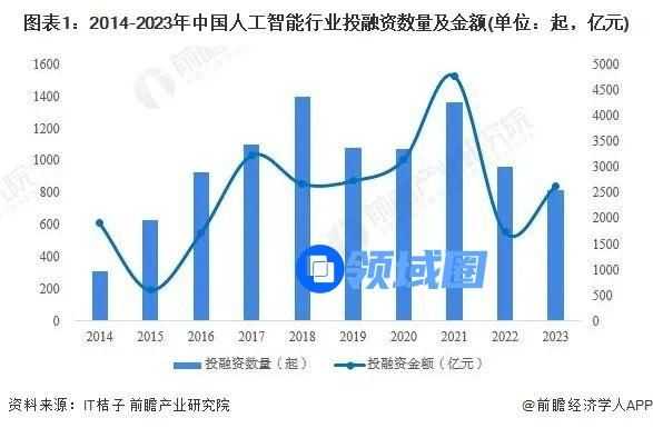 政策之外,资金的流向最能反映一个产业的发展前景。我们先看基本盘,据前瞻经济学人的有关数据可知,自2014年以来,中国人工智能行业迎来了投融资的热潮,在2018年达到顶峰,投资金额和事件数量均显著增长。2018-2021年,人工智能投资额总体呈增长与波动并存的趋势,其中,2021年达到一个新顶峰,投融资达1362起,金额高达4761亿元人民币。