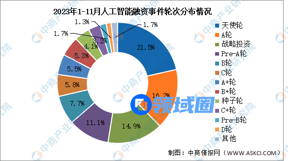 投资轮次方面,截至2023年,中国人工智能融资事件主要以早期投资为主,其中A轮及以前环节占比最多,Pre-IPO、战略融资及以后环节事件数量相对较少。根据中商情报数据,2023年,我国人工智能投资轮次占比为天使轮21.5%。A轮、战略投资、Pre-A轮、B轮的占比分别为16.2%、14.9%、11.1%、7.7%。