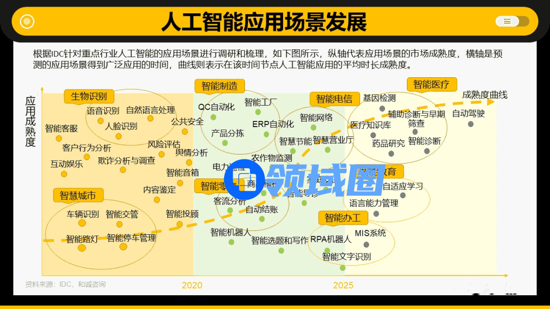 目前我国“人工智能+”应用主要集中在先进制造和企业服务领域,例如中国商飞利用人工智能进行飞机设计和仿真,大幅缩短研发周期,旷视科技以人工智能人脸识别技术闻名,提供包括智能安防、智能金融、智能手机、智能零售等解决方案。据IDC数据,这两个领域也是目前人工智能相关融资事件中占比最多的领域,而交通、医疗、教育、农业等领域也均被纳入了人工智能应用场景发展展望,其中各细分领域的细分赛道,或许是未来值得开垦的生态位。