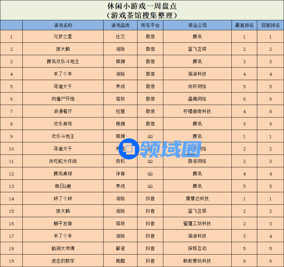 休闲新游周报每周统计微信小游戏、QQ小游戏、抖音小游戏、硬核小游戏以及App Store和Google Play上的新游爆款,并按照分类制作表格,将游戏排名情况等信息公布,希望给到行业同侪帮助。