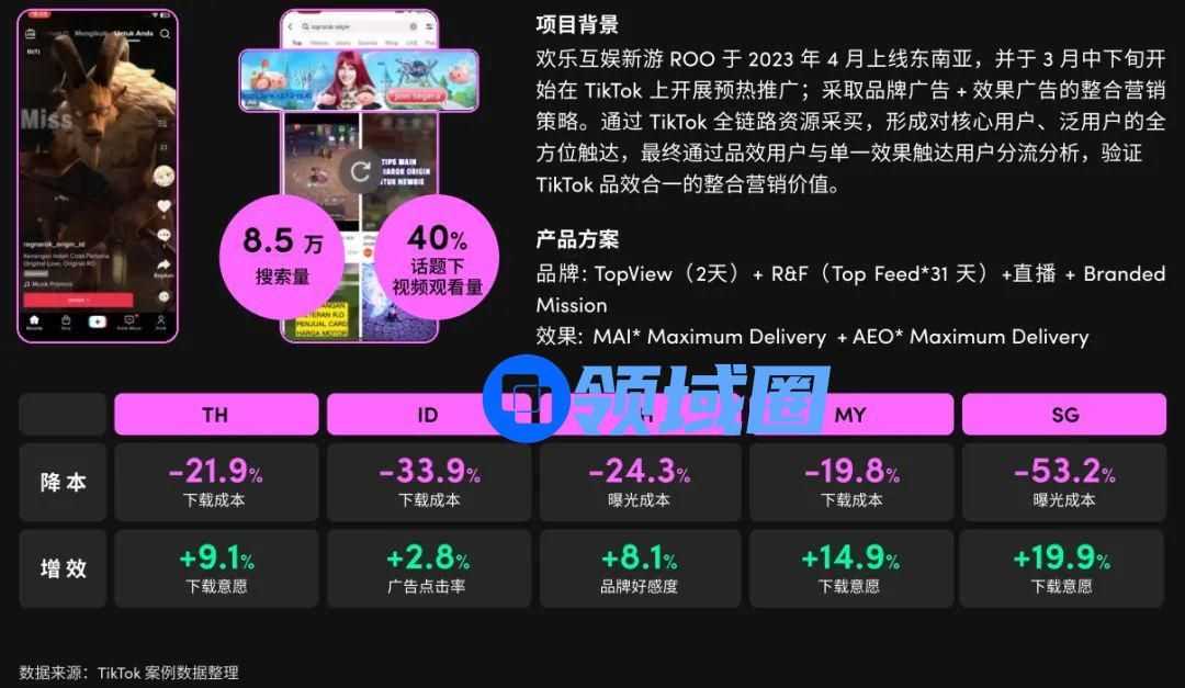 透过品效合一打法,出海厂商在TikTok上可以取得更好的买量效果,切实做到整体投放的降本增效。如欢乐互娱的新游《ROO》在东南亚上线期间数据,便是好例子。