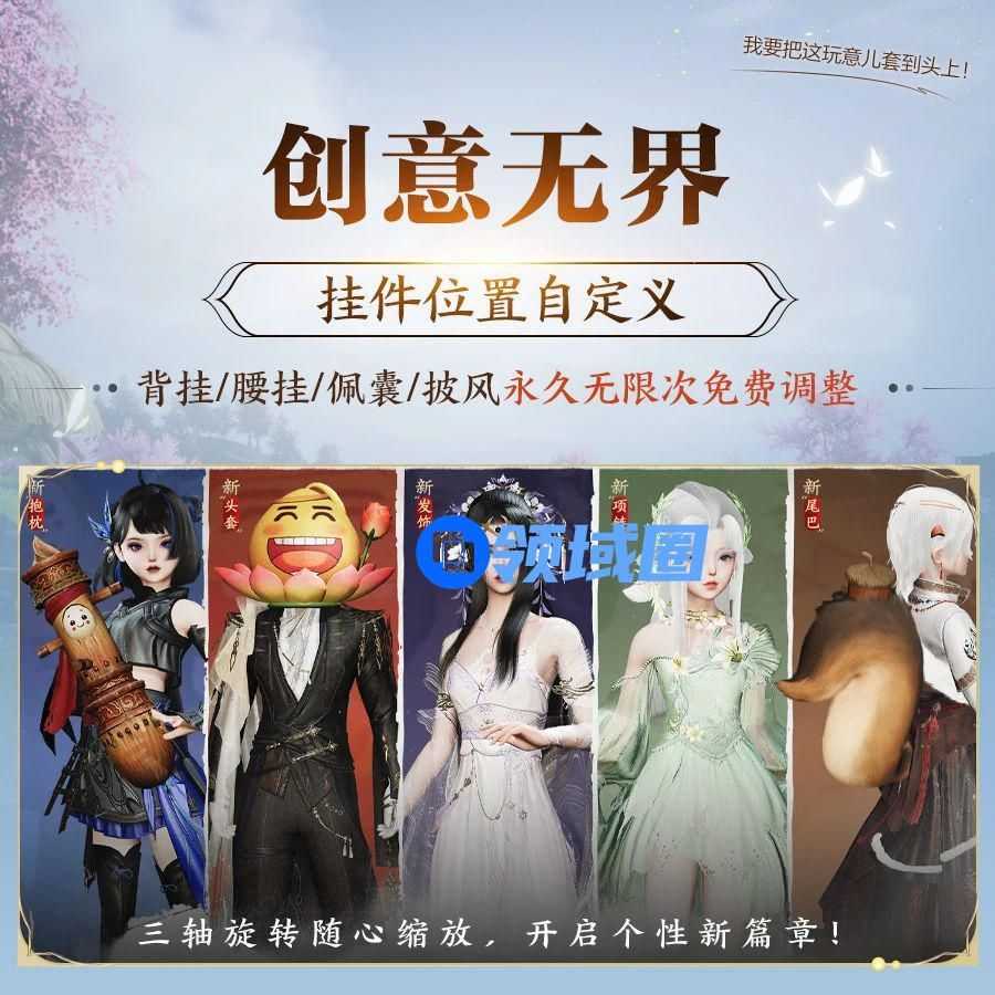 挂件用途更多样,风格无限由你决定,解锁更多创意空间,挂件位置自定义开启个性新篇章!【背部挂件】、【腰部挂件】、【佩囊】、【披风】(除包肩披风)多种类型均可调整,大小缩放配合三轴移动旋转更加自由!今天的你又有什么好创意?快来和亲友们一起体验与分享吧!