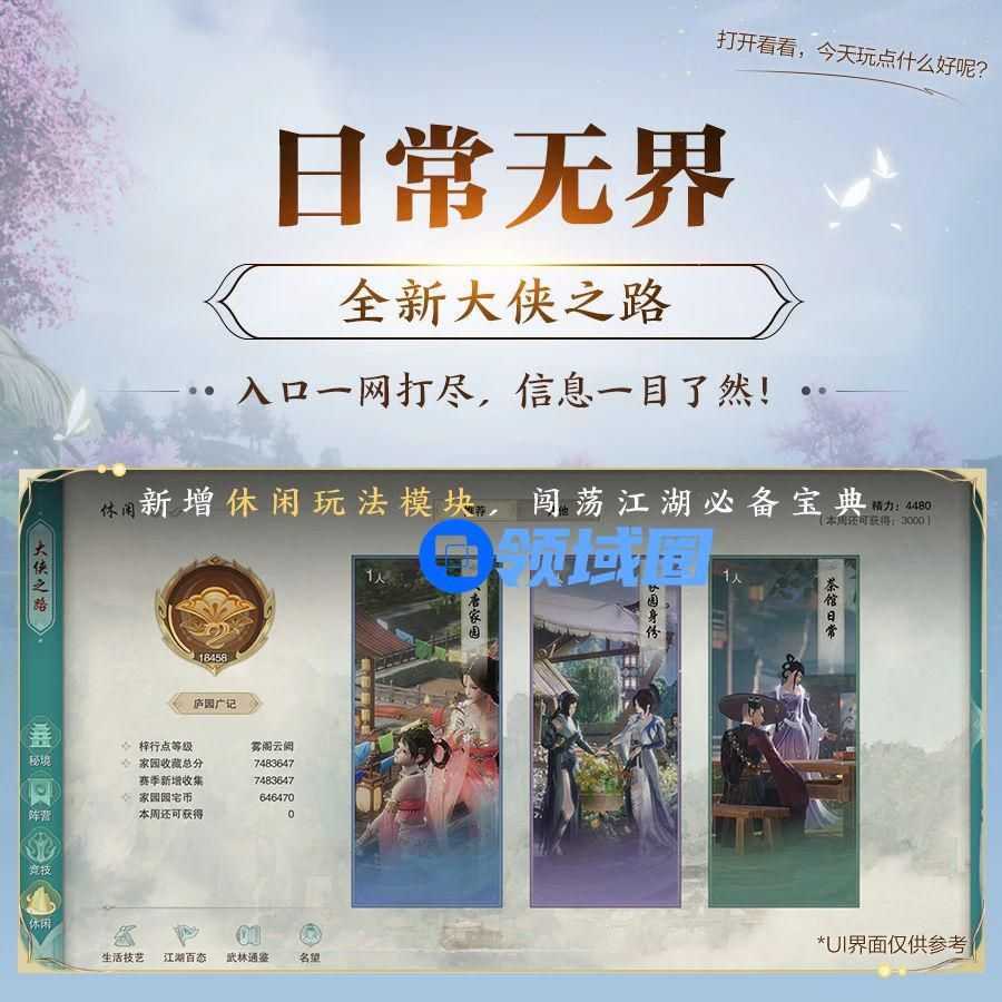 玩法内容平铺展示,多样信息集中成列,新大侠之路作为一个常驻的按钮,将所有玩法和活动重新整理,提取侠士们想要了解的综合信息,心念所动,想玩就玩!不仅在高峰期也可一键匹配名剑大会,无需排队进入主城,更新增“休闲”版块,优化你的PVX体验!海量内容不再令人眼花缭乱,多种玩法清晰了然!