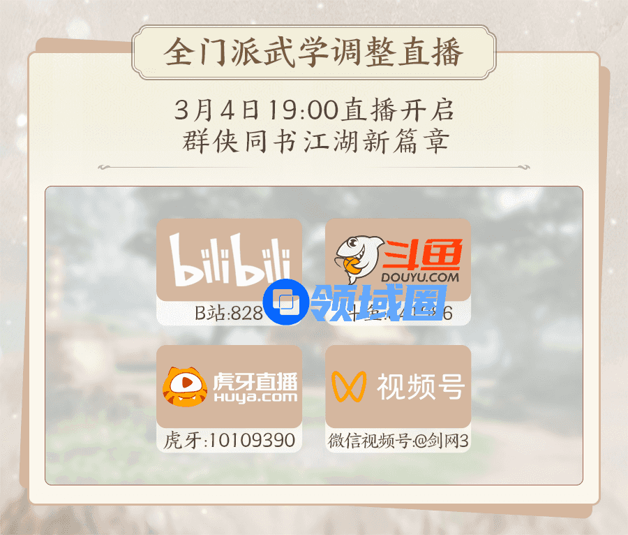 大唐江湖全新篇章帷幕初启!新一轮全门派武学调整直播将于3月4日19:00全网同步开播,欢迎侠士们锁定各大平台,不见不散!