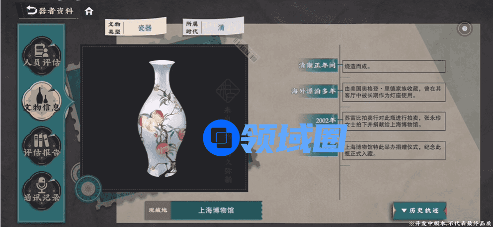 如前文中提到蝠桃瓶,也是我很喜爱的角色,全名为“清雍正景德镇窑粉彩蝠桃纹瓶”,桃妹(玩家爱称)的衣服上就有古物的同款蝠桃纹样,主要颜色也取自原古物。蝠桃瓶的性格设定是怕生恋家,源于古物本身曾漂泊在外后经拍卖才回家的史实。