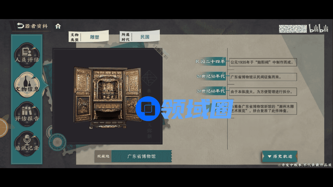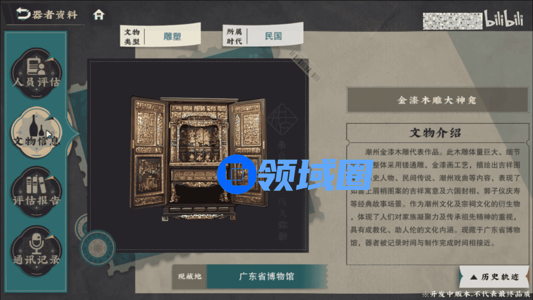 还有金漆木雕大神龛,是来自于中国两大木雕体系中的潮州金漆木雕代表作品,在游戏中的语音带着潮汕口音的普通话。在以前的测试期间,我还将大神龛设成过看板郎,每次点击后触发的语音,都会让人忍不住笑着去学他那有些上头的口音。还有,大神龛衣服上的金色吉祥纹样也对应着现实中古物身上的镂通雕与金漆画工艺。