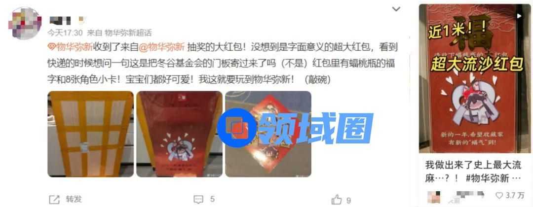 除了在文化发扬上贡献自己的微薄力量,对一直陪着游戏的玩家们,《物华弥新》也保持着一贯的真诚。今年年初,《物华弥新》借着立春推出了春日答新活动,不仅预备了两款微信红包封面,更准备了周边“大礼”——真的给到了玩家物理意义“大”红包。收到快递的玩家们纷纷在社交平台反馈,以为自己收到了一个门板。有玩家更是将这个大红包做成了近一米大的流麻,真是让没有得到的人馋哭了。