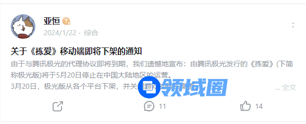“由于与腾讯极光的代理协议即将到期,我们遗憾地宣布:由腾讯极光发行的《拣爱》将于5月20日停止在中国大陆地区的运营。”