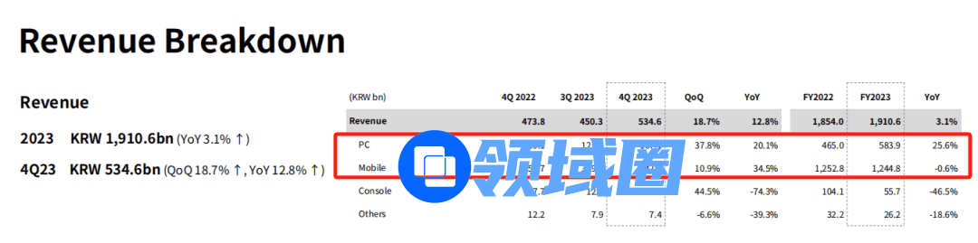 2023年,PC营收同比增长20.1%至5839亿韩元(约合人民币31.44亿元),而手游业务则同比增长34.5%至12448亿韩元(约合人民币67.04亿元)。