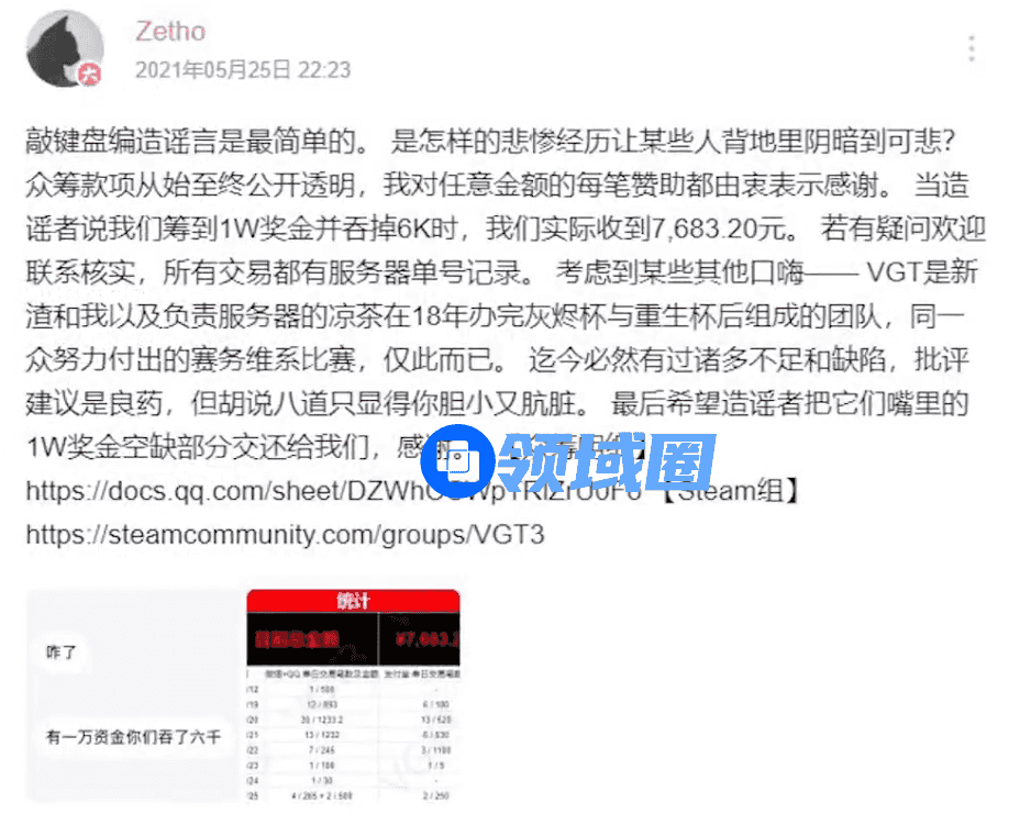 办比赛并不是在贴吧里喊一嗓子这么简单,泽粥和VGT团队将大量精力花在了协调、沟通与安排之上,有时,甚至还得倒贴钱,但即便如此,还是有人造谣他们贪污奖金,包庇选手。