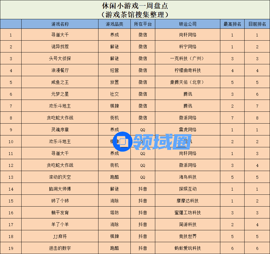 休闲新游周报每周统计微信小游戏、QQ小游戏、抖音小游戏、硬核小游戏以及App Store和Google Play上的新游爆款,并按照分类制作表格,将游戏排名情况等信息公布,希望给到行业同侪帮助。