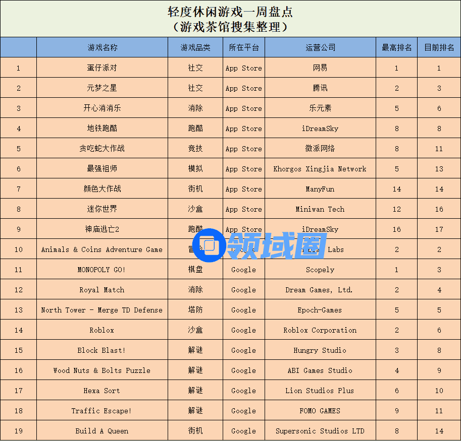 手游方面,网易《蛋仔派对》和腾讯《元梦之星》两款派对游戏的人气居高不下,本周持续稳霸超休闲榜单的TOP2。