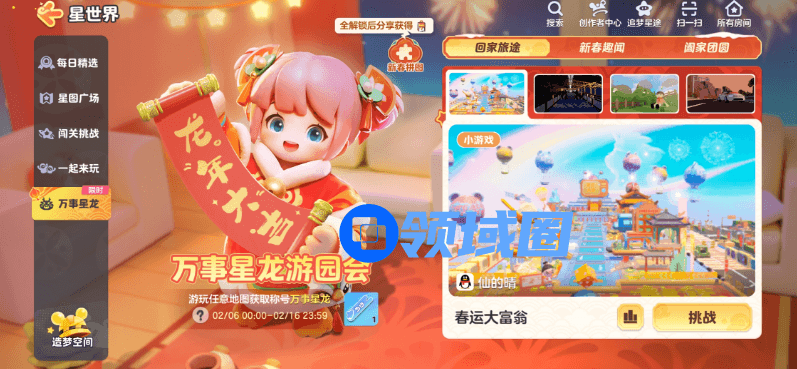 此外,星世界推出的春节限时活动“万事星龙游园会”也推荐了一批既有节日特色,又有着各自不同风格的UGC地图,分别冠以回家旅途、新春趣闻、阖家团圆等章节名称,和玩家回家过年的经历相呼应,在体验时很容易激发起情感的共鸣。