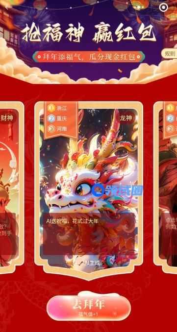 2月6日至2月18日,顺网唠唠正式开启“抢福神 分红包”AI拜年活动。“龙神、财神、爱神、考神……”,福神齐聚,用户可轻松选择任一福神送出语音版个性祝福,让你的新年祝福变得更加有趣味和新意。参与活动还可以为家乡省份“赢福气”,共分新年红包封面、万元红包等奖励。