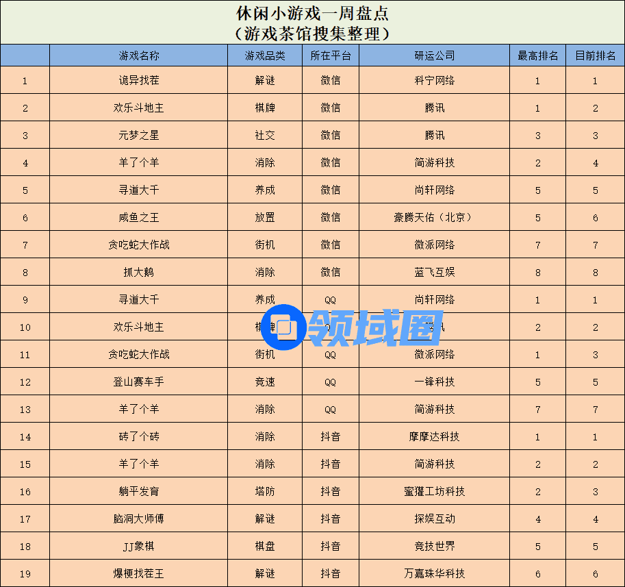 休闲新游周报每周统计微信小游戏、QQ小游戏、抖音小游戏、硬核小游戏以及App Store和Google Play上的新游爆款,并按照分类制作表格,将游戏排名情况等信息公布,希望给到行业同侪帮助。