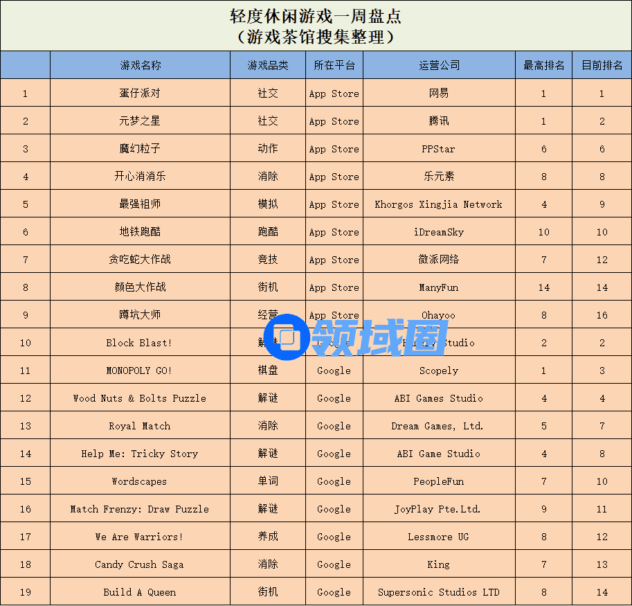 手游方面,网易《蛋仔派对》和腾讯《元梦之星》两款派对游戏的人气居高不下,本周持续稳霸超休闲榜单的TOP2。