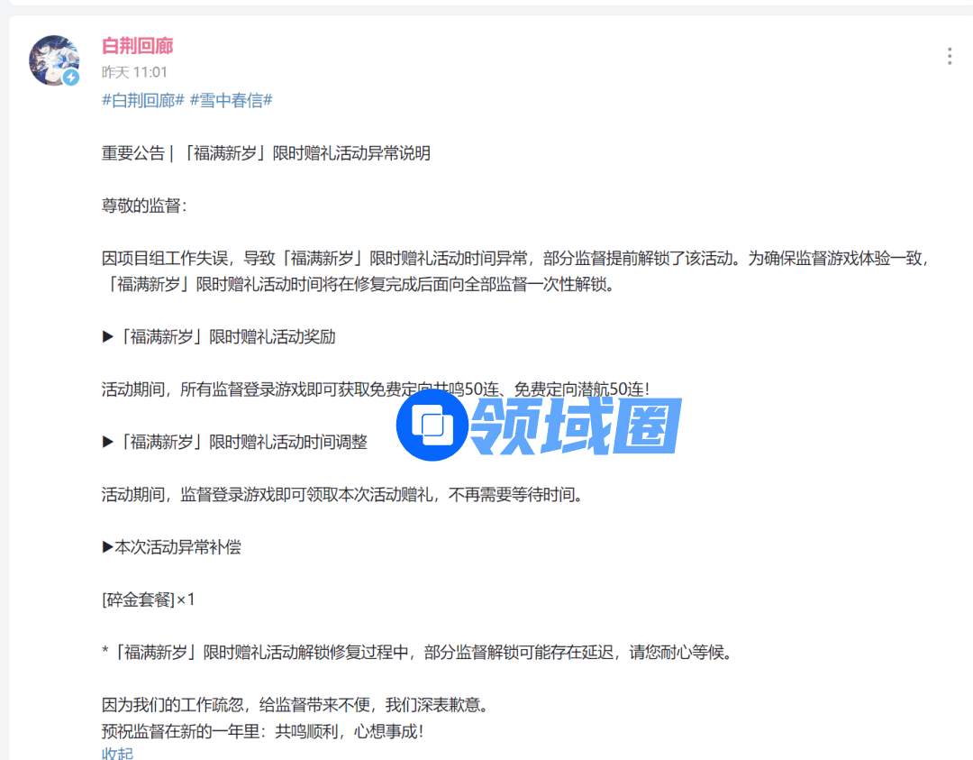 尤其是在2月1日这天,《白荆回廊》在这个重要的日子里还犯了一个“小错误”,原因在于他们把原本定在一个近20天周期赠送的100抽奖励一次性发放给了玩家。对于官方来说,这算是非常严重的运营事故了。