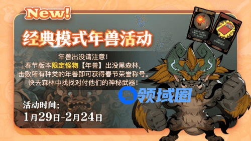 一年一度的年兽主题活动现已开启,此前错过往期活动的玩家这次千万要把握住机会。游戏中限时新增三个年兽怪物:大地之年兽、海潮之年兽、燃烧之年兽,全部击败即可解锁对应荣誉成就。