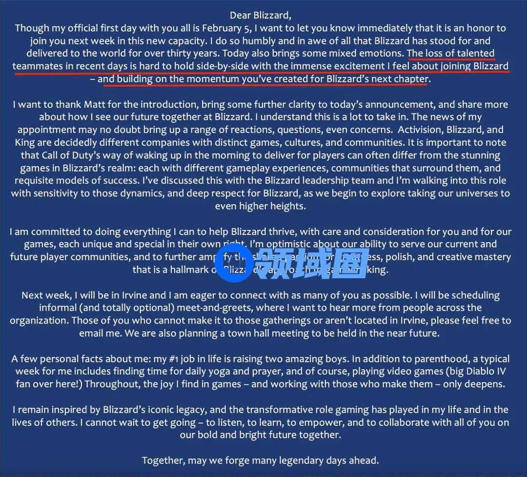 Faries在发予暴雪员工的电子邮件中提到,她将于2月5日正式上任,并发表了对近期裁员的复杂情感:“最近几天失去才华横溢伙伴的遗憾与我加入暴雪、将与你们一起创造暴雪崭新篇章的巨大兴奋确实有些难以并存。”