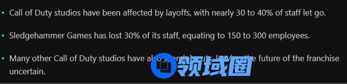 Sledgehammer Games大锤工作室已裁员30%(参与开发《使命召唤:现代战争3》《使命召唤:高级战争》)、Toys for Bob工作室裁员超30%(为《使命召唤:战区》《使命召唤:现代战争2》提供技术协助)、High Moon Studio工作室裁员10%(参与开发《使命召唤:幽灵》和《使命召唤:战区》),Treyarch、Infinity Ward、Raven Software、Solid State Studios、Beenox 和 Demonware 等各大《使命召唤》工作室也失去了相当数量的员工。