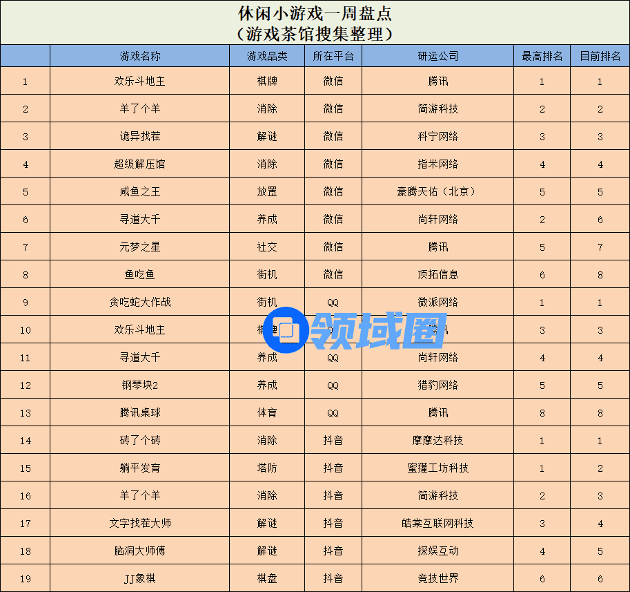 休闲新游周报每周统计微信小游戏、QQ小游戏、抖音小游戏、硬核小游戏以及App Store和Google Play上的新游爆款,并按照分类制作表格,将游戏排名情况等信息公布,希望给到行业同侪帮助。