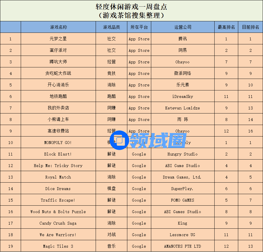 手游方面,腾讯《元梦之星》和网易《蛋仔派对》两款派对游戏的人气居高不下,本周持续稳霸超休闲榜单的TOP2。