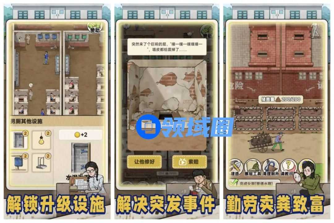 其中,《蹲坑大师》如其名,是一款经营厕所的游戏,玩家需要通过不断升级厕所设施,迎来更多顾客,在获得收益的同时,解锁各种有趣的随即事件。游戏中,玩家不仅需要进行招揽客人、升级设施等常规经营操作,还可以体验到清理厕所、出售擦屁工具、招商卖粪和挑粪等与题材相关的特殊玩法。