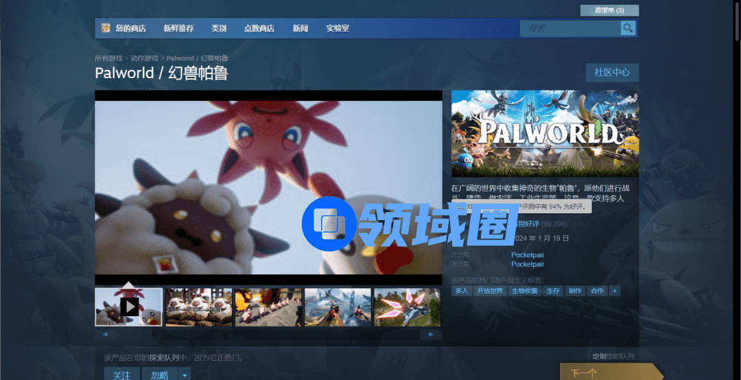 此外,游戏的好评率也相当高。根据Steam的评价统计,游戏的好评率为92%,共有7159条评价。大多数玩家对游戏的创意、画面、玩法和内容都给予了高度评价,认为它是一款非常有趣的作品。玩家们纷纷表示,《幻兽帕鲁》虽然被称为“缝合怪”,但它的趣味性却让人难以抗拒。