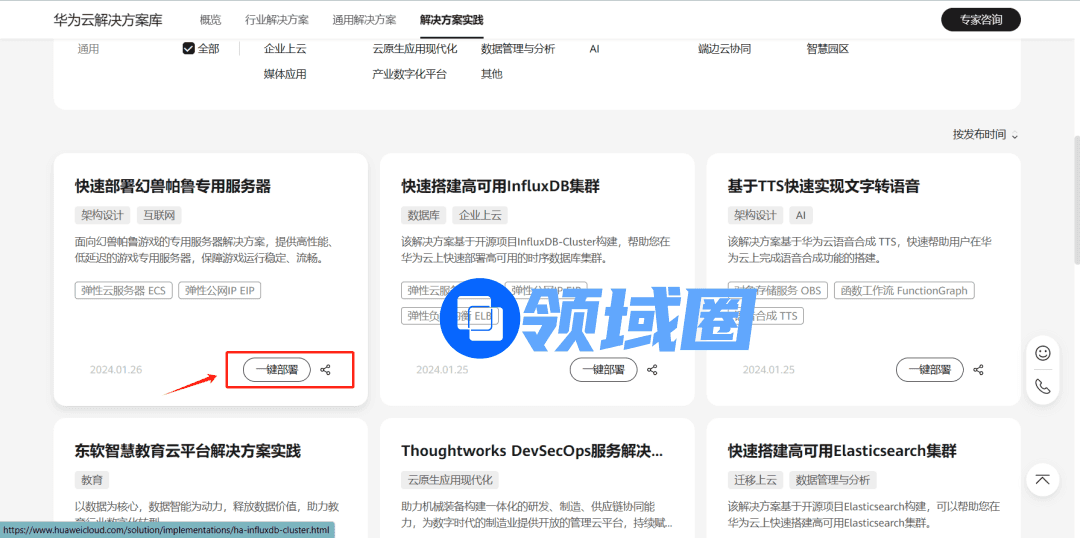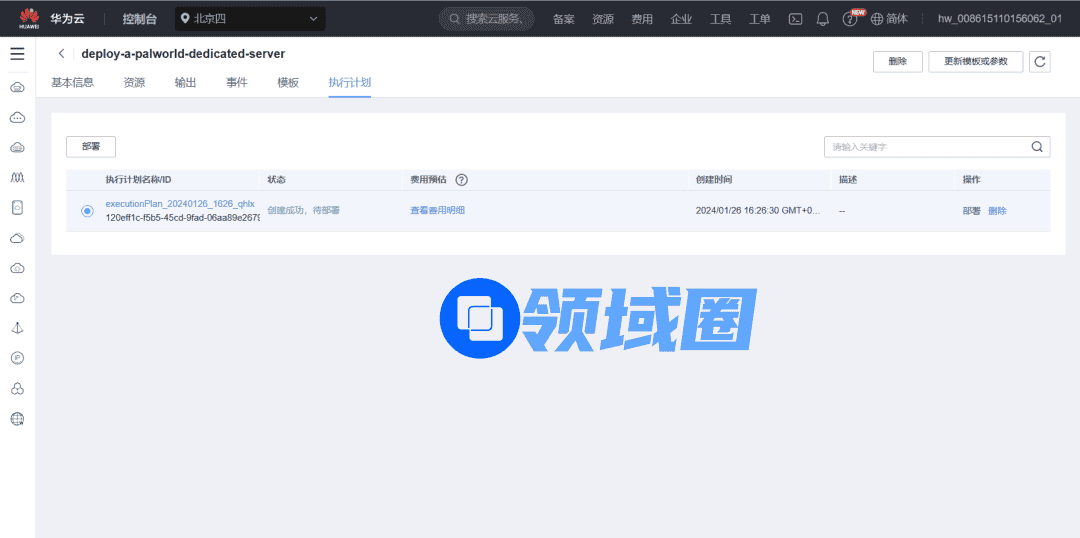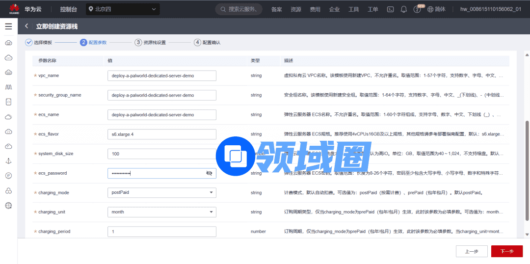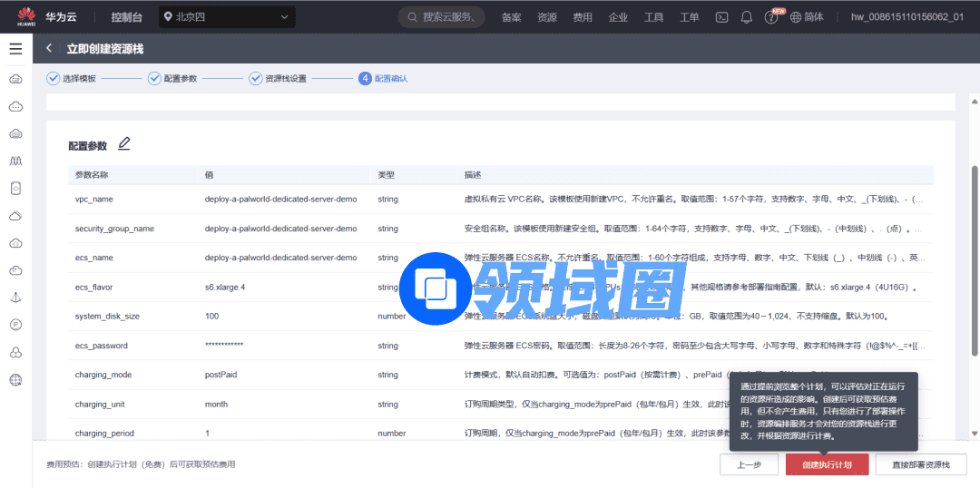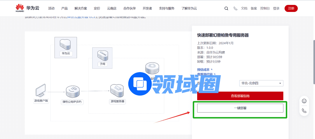 下面就正式进入我们的一键部署的实战了!打开华为云官网,找到快速部署幻兽帕鲁专用服务的页面,数据中心下拉菜单可以选择需要部署的区域,单击“一键部署”,跳转至解决方案创建堆栈界面。