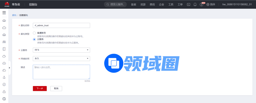界面中的“创建委托”按钮,在委托名称中输入“rf_admin_trust”,委托类型选择“云服务”,输入“RFS”,持续时间“永久”,然后单击“下一步”。