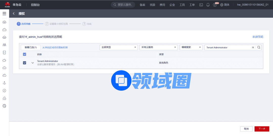 在搜索框中输入“Tenant Administrator”权限,并勾选搜索结果,单击“下一步”。