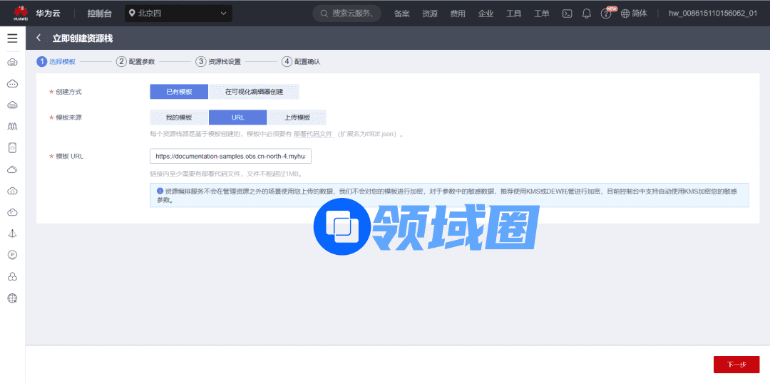 这里我们所做的工作是创建资源栈,华为云已经为你把模板搭建好了,我们直接闭眼下一步。