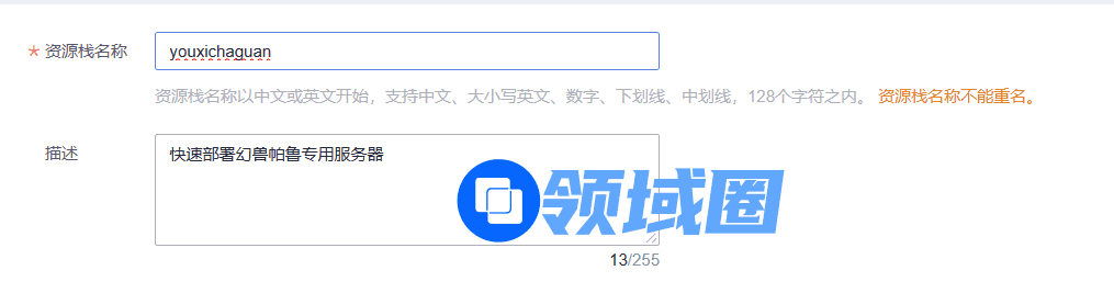 这里比较重要,进行参数配置。首先是资源栈的名称不能重复,但是支持中英文,比较友好。另外,第二张图里面这一堆,只有“ecs_password”的部分,需要你写一个自己服务器的密码,要记牢,并且至少包含大小写英文字母以及特殊服务或者数字。