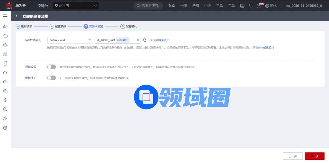 完成后,我们就可以在资源设置界面中,在权限委托下拉框中找到刚才我们在准备活动中“rf_admin_trust”委托,单击“下一步”。