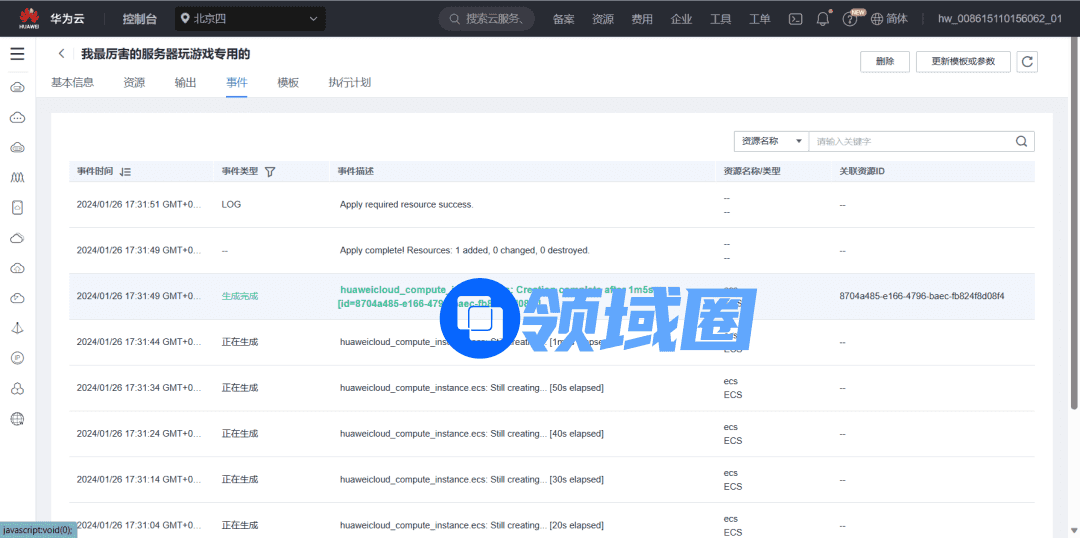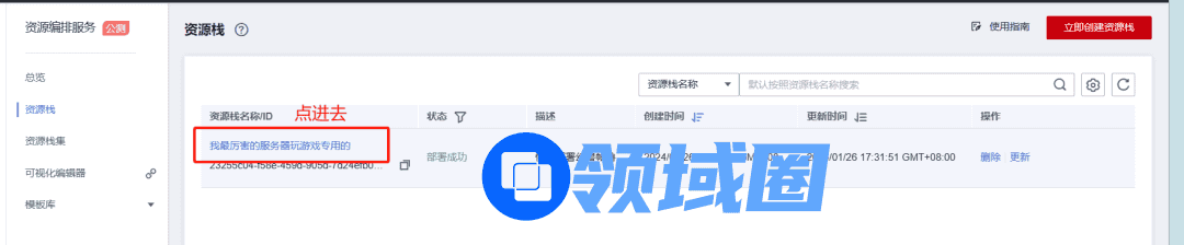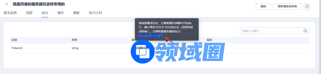 启动成功后,我们去“控制台”,找到“堆栈”,找到你刚才建立的资源栈中的名称,点进去。然后从“输出”选项那里,鼠标移过去就出现了你的幻兽帕鲁的服务器地址了,把它保存下来。至此,我们就可以关闭浏览器,安心地去见“帕鲁”了。