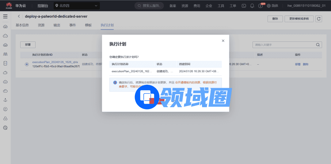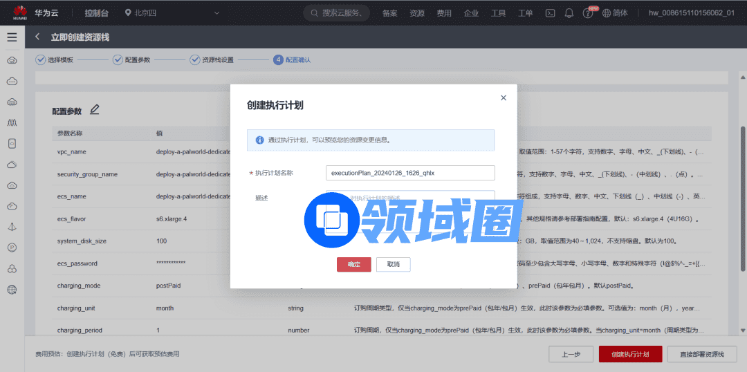 在配置确认页面中,单击“创建执行计划”。在弹出的创建执行计划框中,自定义填写执行计划名称,单击“确定”。
