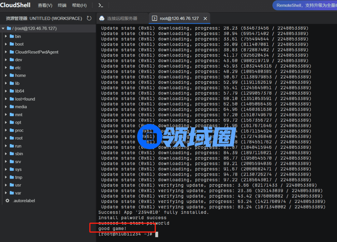 这是一个脚本的命令,粘贴进去直接按回车。一直等待“good game”的字样出现后,恭喜你,你的部署已经完成了。这里需要注意的是,有些小伙伴可能在安装幻兽帕鲁专用服务器时,由于网络波动问题可能会运行失败,如果失败了会自动重试几次。