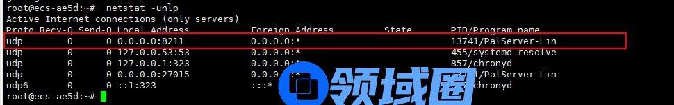 如果“good game”的字样出现后你还是不放心,你也可以输入netstat -ulpt命令,检查幻兽帕鲁服务器的8211端口是否启动成功。