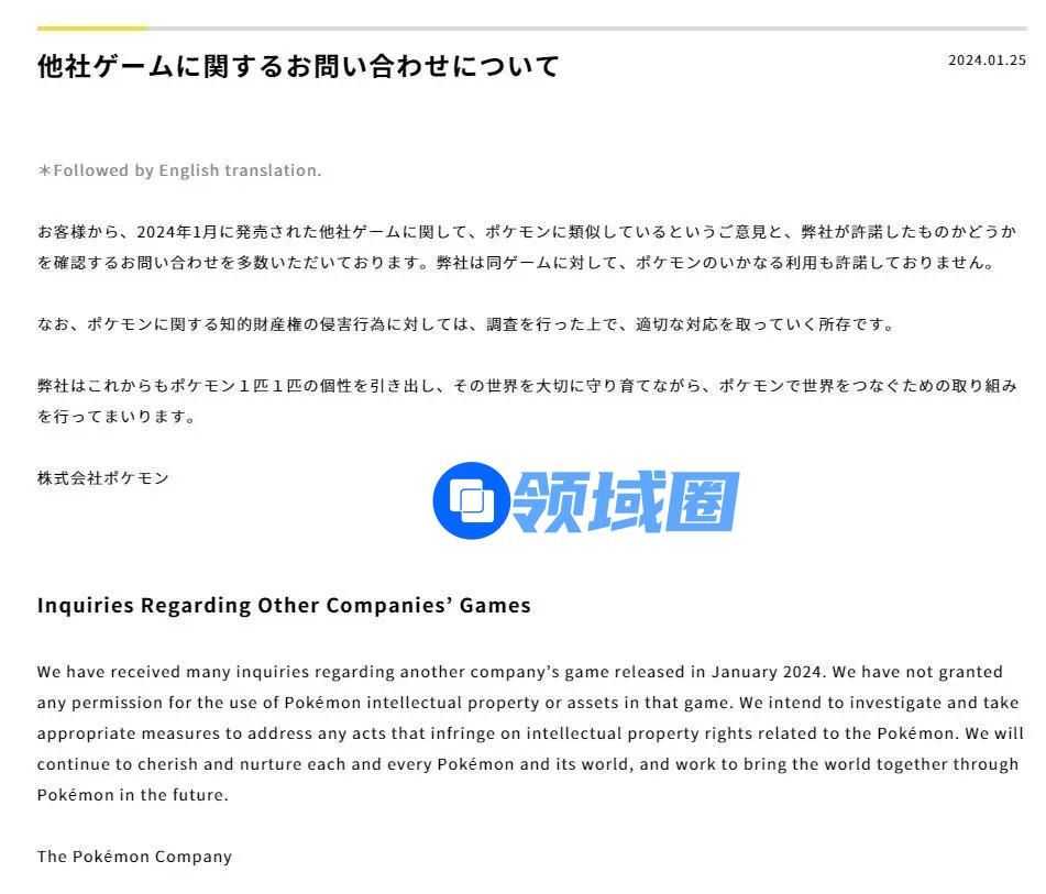 我们并没有授权该游戏可以使用宝可梦IP的任何知识产权。另外,对于任何有关宝可梦知识产权的侵权行为,我们都将会在进行调查之后采取适当的措施。本公司将一如既往的挖掘每一只宝可梦的个性,并努力培养和保护它的世界,未来也会通过宝可梦让整个世界团结在一起。”