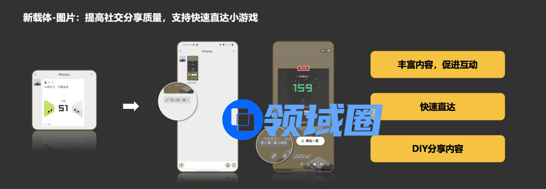 通过这些链接,玩家体验在微信生态圈里流转,从而传递并放大开发者创意:从微信内部链接到微信外部应用、跨平台场景,形成微信小游戏生态的全场景。