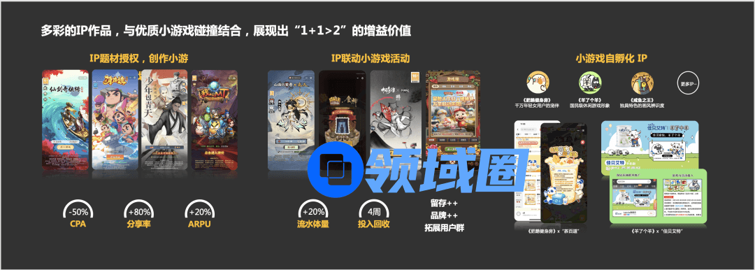 在IP授权方面,《仙剑奇侠传之新的开始》小游戏团队便在公开上分享,在IP加成和怀旧情绪的催化下,游戏获客成本低于同品类小游戏。此外在IP联动方面,通过推出限时活动,联动期间流水提升,用户留存也获得一定提升。