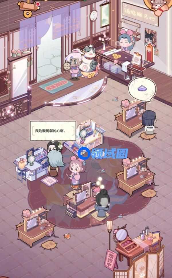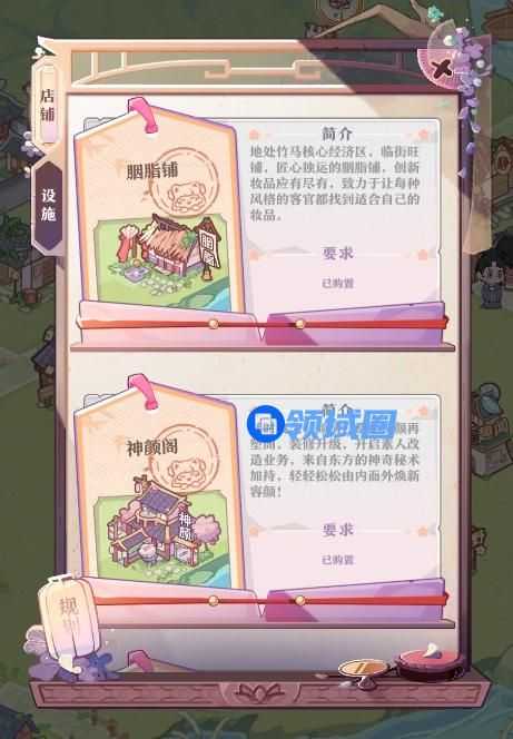 在大地图中,玩家也可以解锁更多的店铺与设施。你不再单单只经营一个小小的胭脂铺,还将拥有神颜阁、四季田野以及美愿屋这三个新产业。