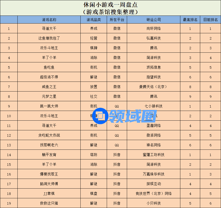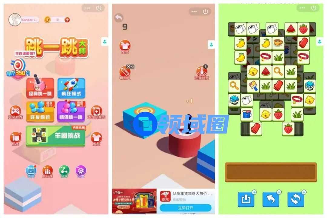 在QQ小游戏平台上,《跳一跳大师》又一周稳坐热玩榜单第一。《跳一跳大师》致敬了经典小游戏《跳一跳》的核心玩法,并在此基础上增加了疯狂模式、好友合作、情侣模式等更多模式玩法。并且在“跳一跳”玩法之外,该游戏还额外增加了一个“羊圈挑战”,将类似《羊了个羊》的玩法加入到了游戏中。综上,该游戏内容可谓是“集众家之所成”。