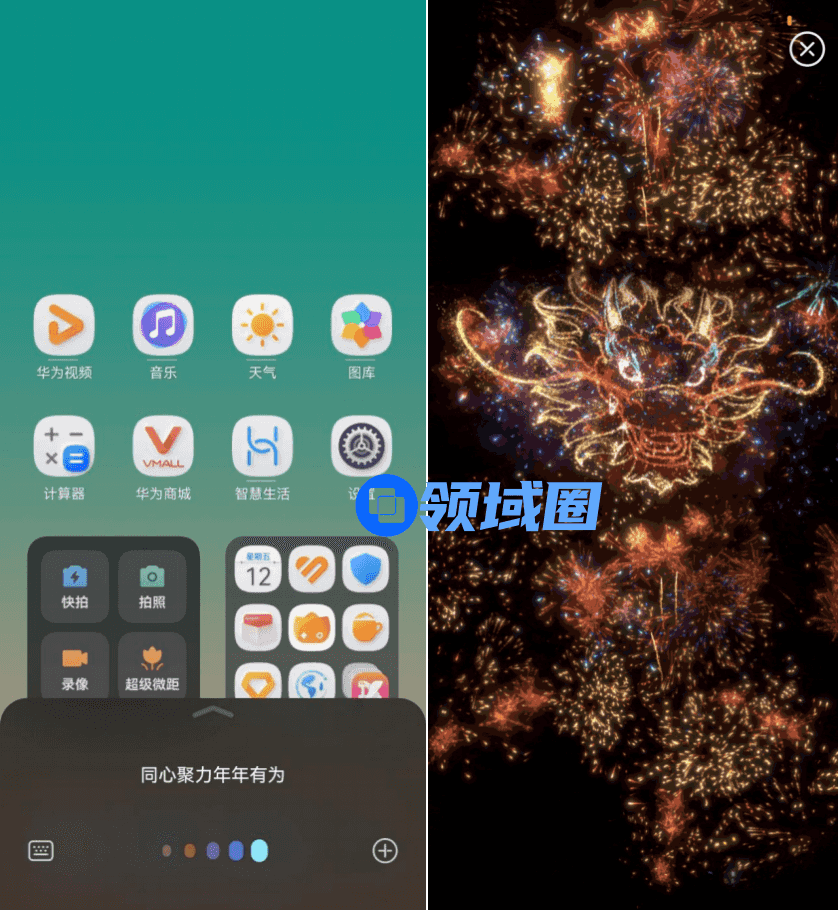 除此之外,来试试长按电源键或者语音唤醒小艺说出魔法口令词“同心聚力年年有为”或者“年年有为”,让聪明、贴心又能干的小艺给你放一场祥龙烟花,你的手机也能很有新年氛围感。