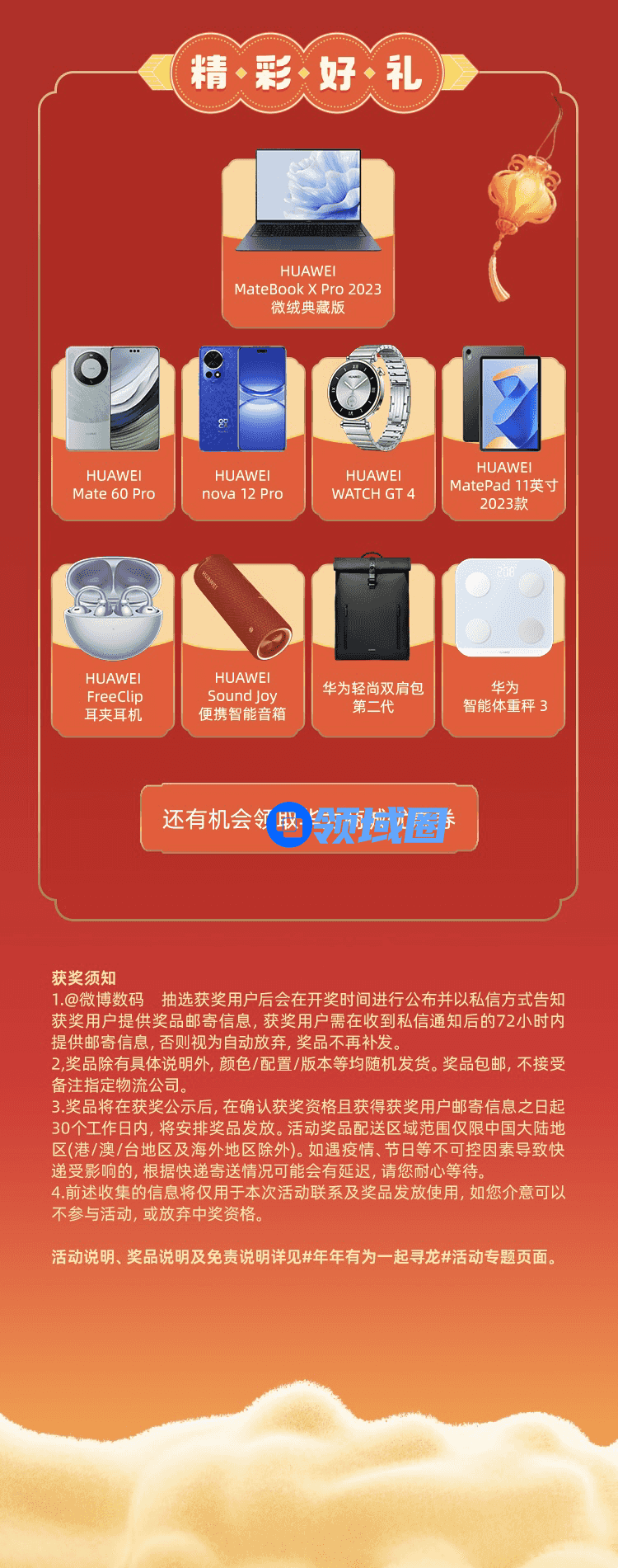 完成挑战更有精彩好礼相送,不仅有机会抽取HUAWEI Mate 60 Pro、HUAWEI nova 12 Pro等多款华为终端产品,还有机会领取华为商城优惠券,参与活动试试你的运气,龙年天选之人可能就是你!