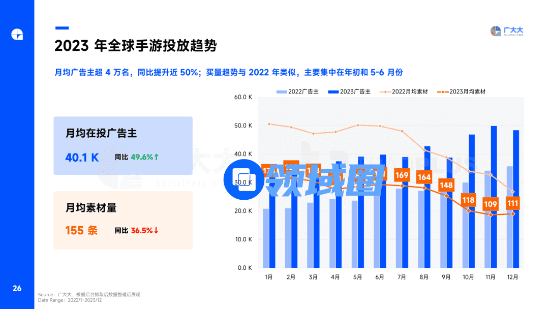 2023年手游月均广告主超4万名,比2022年提升近 50 %;观察各月手游的买量趋势与2022年十分类似,月均素材量的峰值集中在5-6月份,随后在年底下降。