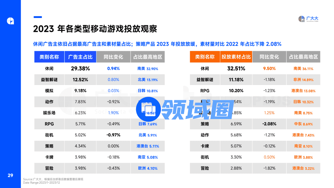 休闲品类依旧有着最高广告主和素材量占比,其中休闲素材占比对比去年提升9.5%。策略类产品无疑是2023年营销缩水最为严重的品类,在广告主占比与2022年几乎持平的前提下,占比下降超2%。