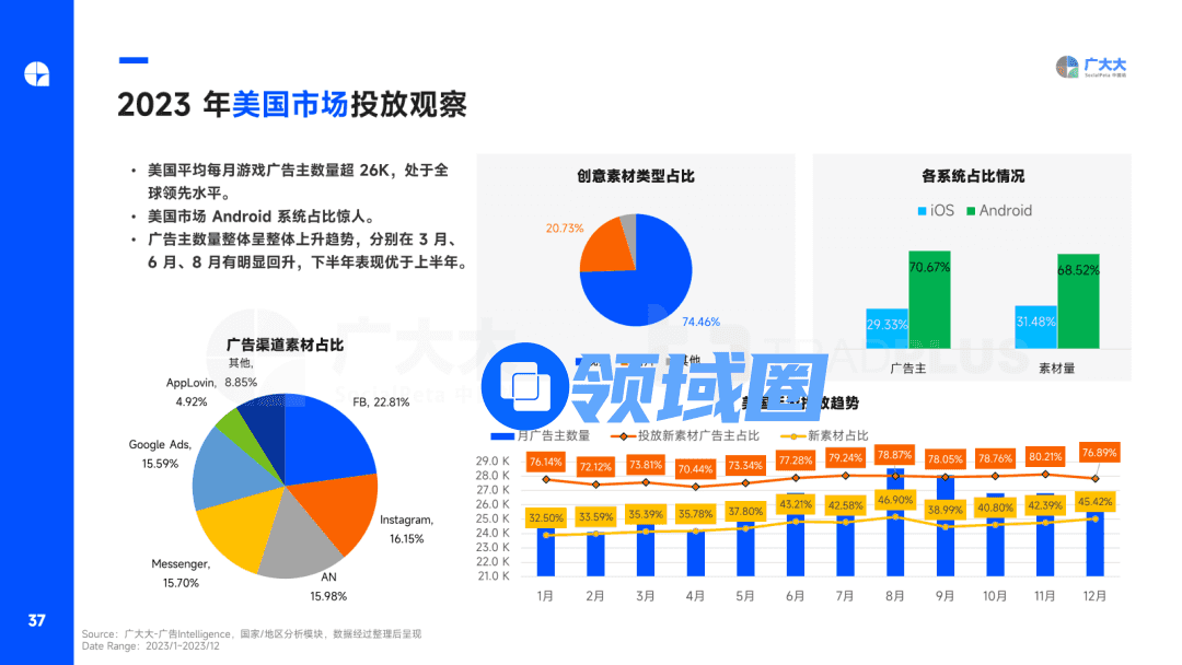 2023年美国平均每月手游广告主数量超2.6万名遥遥领先于其他国家/地区,其中Android端已经在美国手游营销中占据绝对主力地位,广告主占比超70%,素材量占比超68%。