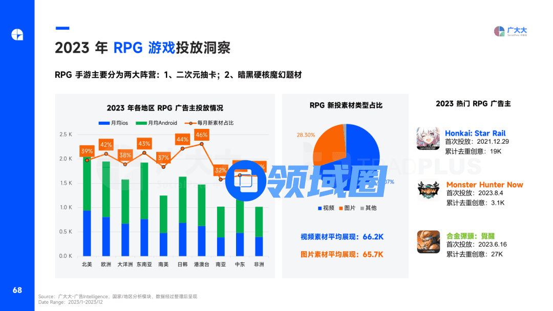 热门游戏品类上,RPG无疑是今年表现最为亮眼的一个赛道,各地区RPG月均广告主平均在1400名左右,每月RPG新素材量占比超35%,其中港澳台地区RPG素材创意迭代最快,月均新素材占比超46%。