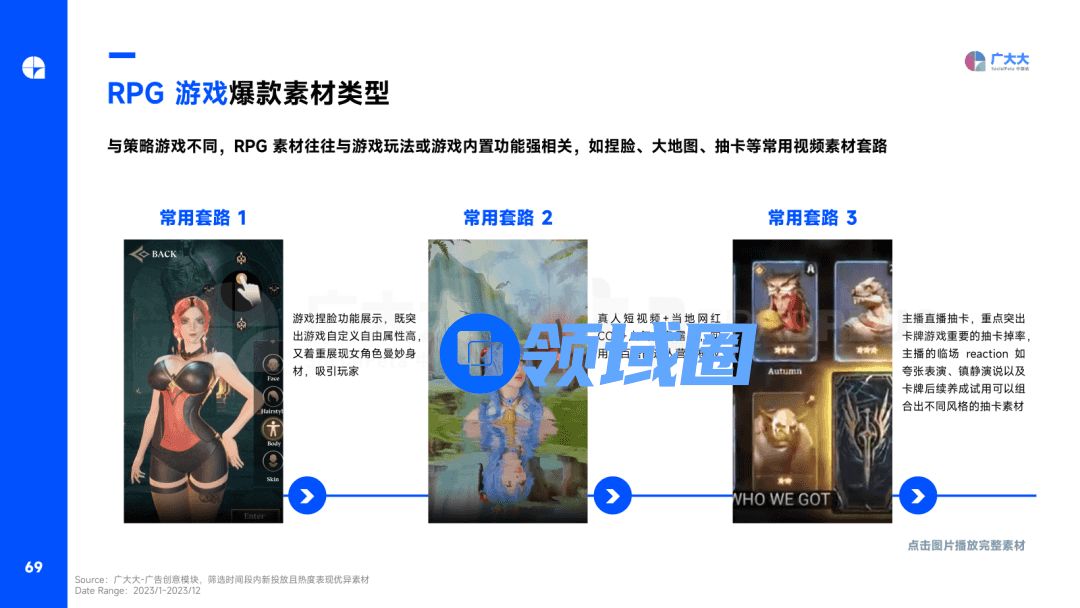 而在RPG产品的热门创意上,很多广告主会重点展示游戏玩法或游戏内置功能强相关,如捏脸、大地图、抽卡等常用素材。